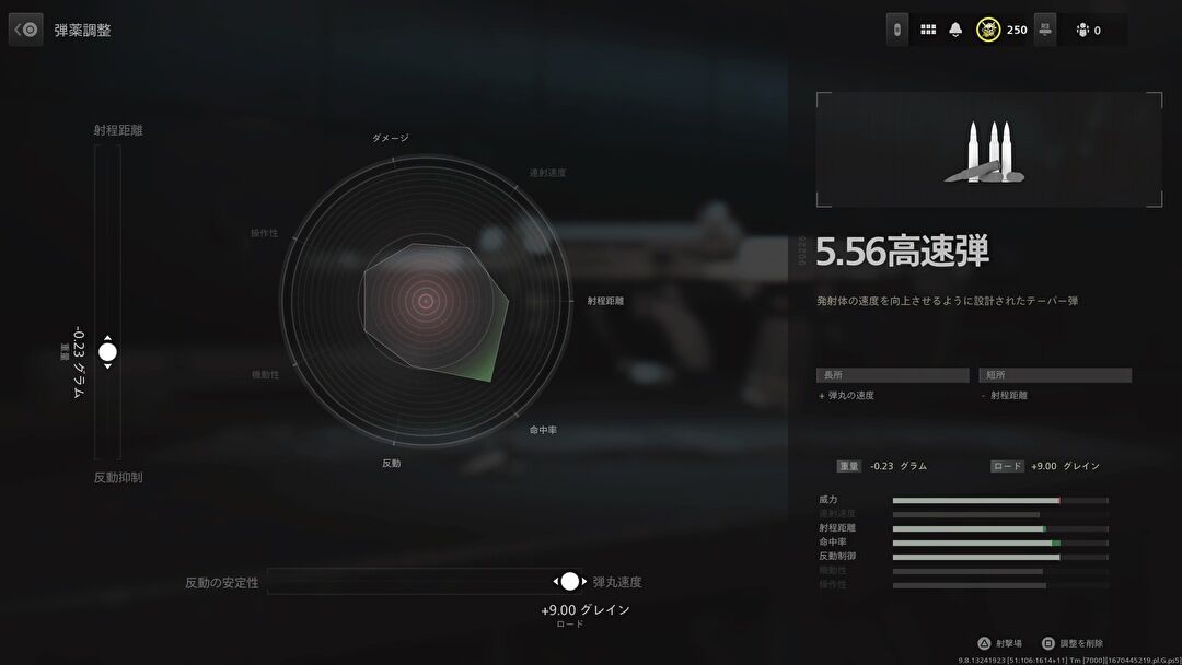 弾薬には5.56高速弾を使っています。このアタッチメントはこの武器の武器レベル7で解放可能です。弾当てを良くするために弾速を強化していますが、アイアンサイトが少し見づらい武器なので、これかコームを外してCRONENミニプロにするのも良いと思います。